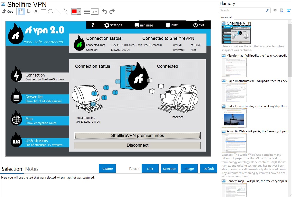 Flamory helps you capture and store screenshots from Shellfire VPN by pressing a single hotkey. It will be saved to a history, so you can continue doing your tasks without interruptions. Later, you can edit the screenshot: crop, resize, add labels and highlights. After that, you can paste the screenshot into any other document or e-mail message.