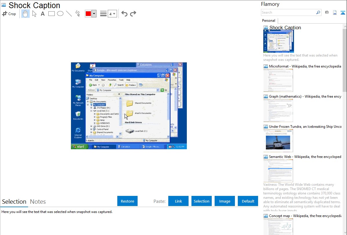 Flamory helps you capture and store screenshots from Shock Caption by pressing a single hotkey. It will be saved to a history, so you can continue doing your tasks without interruptions. Later, you can edit the screenshot: crop, resize, add labels and highlights. After that, you can paste the screenshot into any other document or e-mail message.