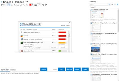 Flamory helps you capture and store screenshots from Should I Remove It? by pressing a single hotkey. It will be saved to a history, so you can continue doing your tasks without interruptions. Later, you can edit the screenshot: crop, resize, add labels and highlights. After that, you can paste the screenshot into any other document or e-mail message.