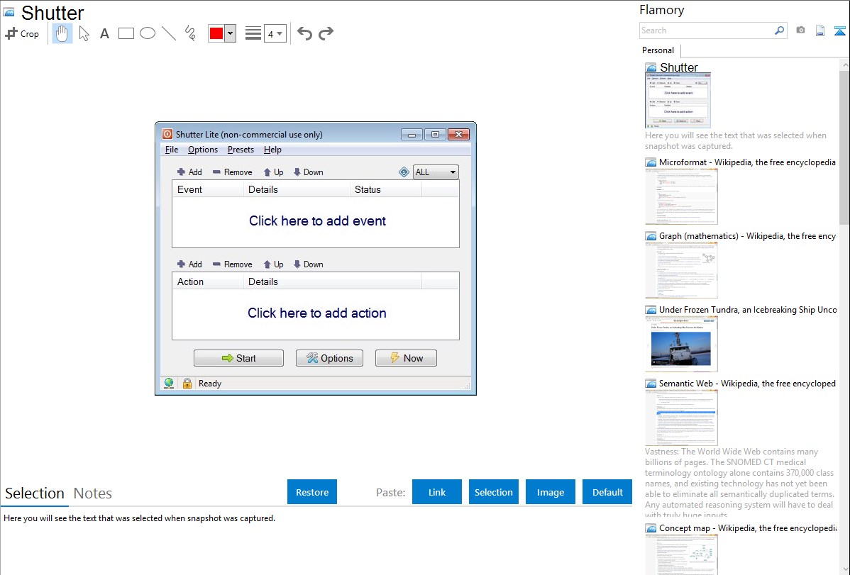 Flamory helps you capture and store screenshots from Shutter by pressing a single hotkey. It will be saved to a history, so you can continue doing your tasks without interruptions. Later, you can edit the screenshot: crop, resize, add labels and highlights. After that, you can paste the screenshot into any other document or e-mail message.
