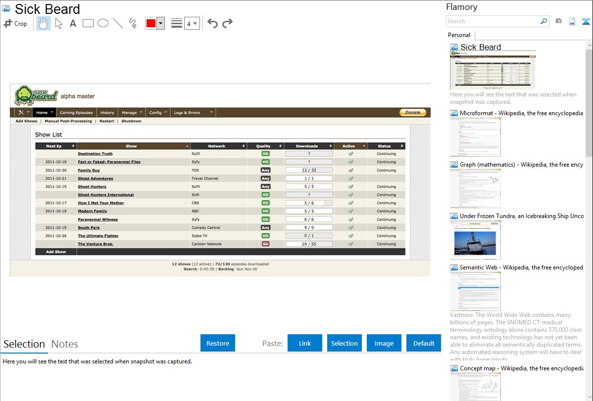 Flamory helps you capture and store screenshots from Sick Beard by pressing a single hotkey. It will be saved to a history, so you can continue doing your tasks without interruptions. Later, you can edit the screenshot: crop, resize, add labels and highlights. After that, you can paste the screenshot into any other document or e-mail message.