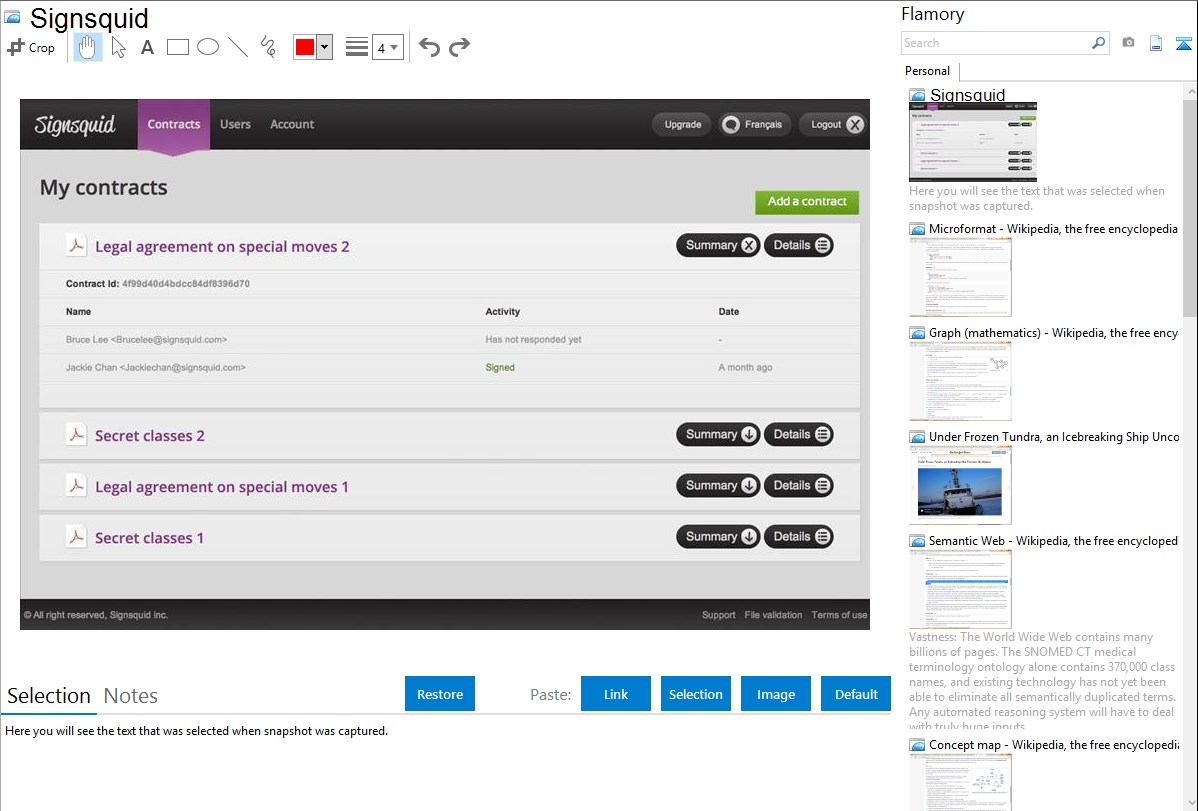 Flamory helps you capture and store screenshots from Signsquid by pressing a single hotkey. It will be saved to a history, so you can continue doing your tasks without interruptions. Later, you can edit the screenshot: crop, resize, add labels and highlights. After that, you can paste the screenshot into any other document or e-mail message.