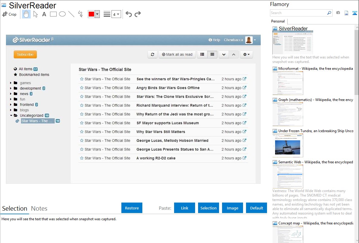 Flamory helps you capture and store screenshots from SilverReader by pressing a single hotkey. It will be saved to a history, so you can continue doing your tasks without interruptions. Later, you can edit the screenshot: crop, resize, add labels and highlights. After that, you can paste the screenshot into any other document or e-mail message.