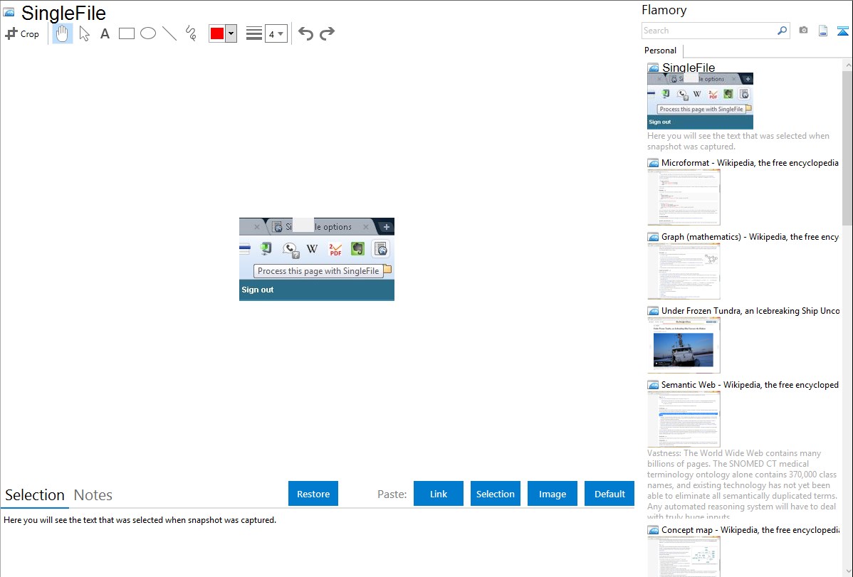 Flamory helps you capture and store screenshots from SingleFile by pressing a single hotkey. It will be saved to a history, so you can continue doing your tasks without interruptions. Later, you can edit the screenshot: crop, resize, add labels and highlights. After that, you can paste the screenshot into any other document or e-mail message.
