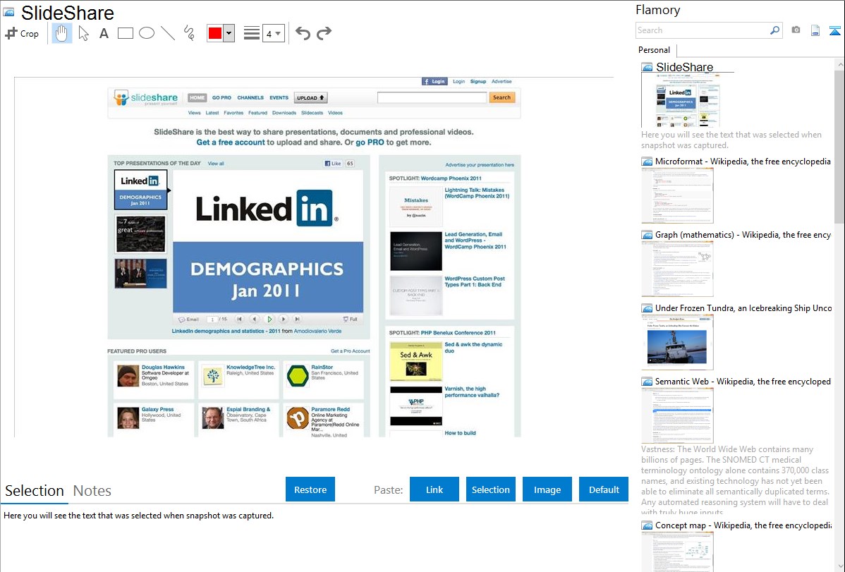 Flamory helps you capture and store screenshots from SlideShare by pressing a single hotkey. It will be saved to a history, so you can continue doing your tasks without interruptions. Later, you can edit the screenshot: crop, resize, add labels and highlights. After that, you can paste the screenshot into any other document or e-mail message.