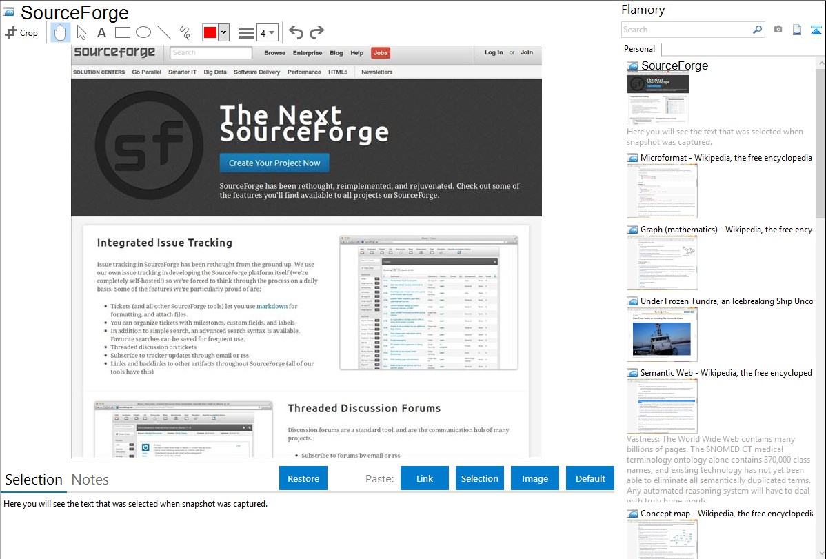 Flamory helps you capture and store screenshots from SourceForge by pressing a single hotkey. It will be saved to a history, so you can continue doing your tasks without interruptions. Later, you can edit the screenshot: crop, resize, add labels and highlights. After that, you can paste the screenshot into any other document or e-mail message.