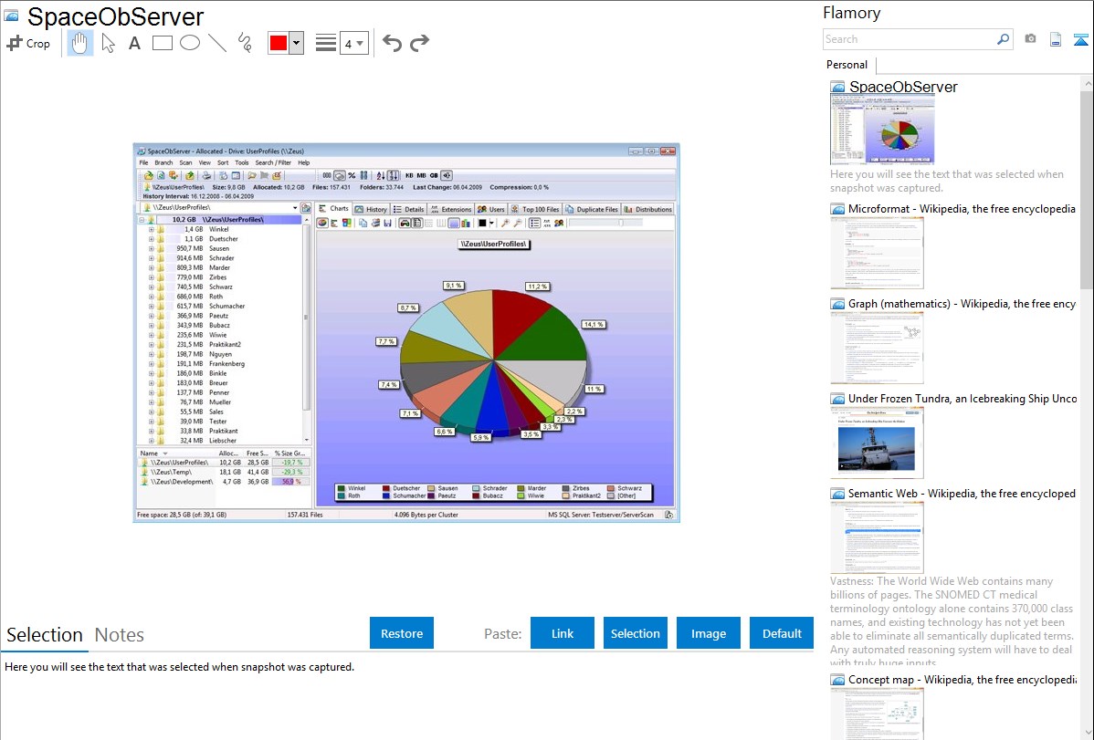 SpaceObServer is a powerful and flexible hard disk space manager for Windows. It scans local and network drives using a background service and stores their structure, sizes and properties in an SQL database. Linux and Unix filesystems can be scanned via SSH (Secure Shell). In an Explorer-like user interface the collected data can be viewed and browsed in hierarchical or tabular views, 3D bar, pie, line charts and tree maps. Using the archived data you are able to track the development of the space usage from past to present, and forecast future size usage.