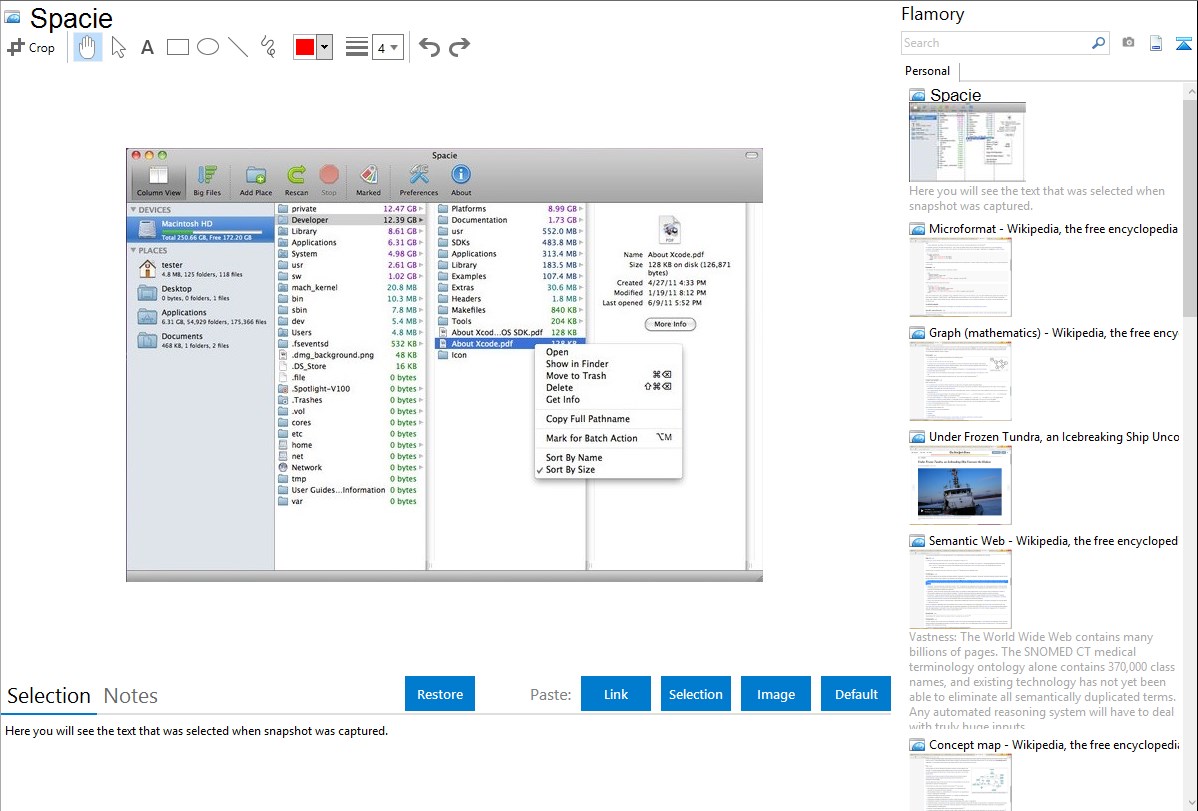 Flamory helps you capture and store screenshots from Spacie by pressing a single hotkey. It will be saved to a history, so you can continue doing your tasks without interruptions. Later, you can edit the screenshot: crop, resize, add labels and highlights. After that, you can paste the screenshot into any other document or e-mail message.