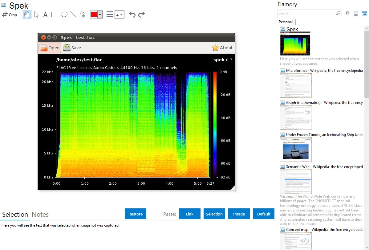 Flamory helps you capture and store screenshots from Spek by pressing a single hotkey. It will be saved to a history, so you can continue doing your tasks without interruptions. Later, you can edit the screenshot: crop, resize, add labels and highlights. After that, you can paste the screenshot into any other document or e-mail message.