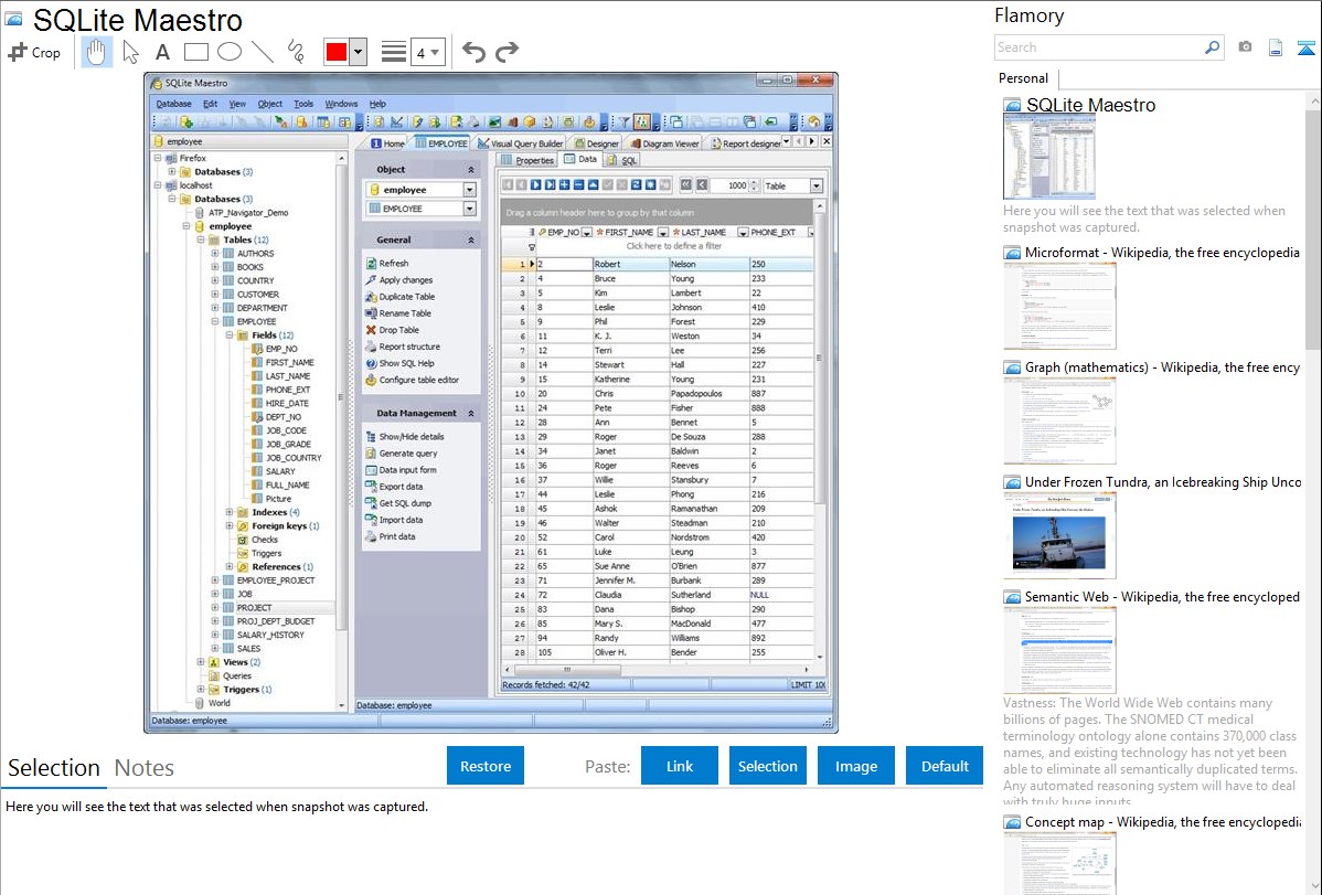 Flamory helps you capture and store screenshots from SQLite Maestro by pressing a single hotkey. It will be saved to a history, so you can continue doing your tasks without interruptions. Later, you can edit the screenshot: crop, resize, add labels and highlights. After that, you can paste the screenshot into any other document or e-mail message.