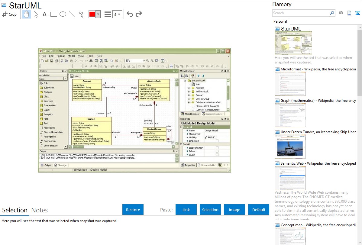 Flamory helps you capture and store screenshots from StarUML by pressing a single hotkey. It will be saved to a history, so you can continue doing your tasks without interruptions. Later, you can edit the screenshot: crop, resize, add labels and highlights. After that, you can paste the screenshot into any other document or e-mail message.