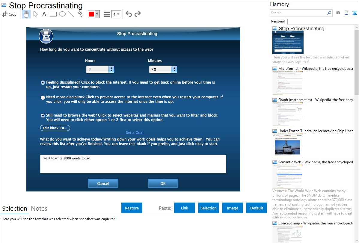 Flamory helps you capture and store screenshots from Stop Procrastinating by pressing a single hotkey. It will be saved to a history, so you can continue doing your tasks without interruptions. Later, you can edit the screenshot: crop, resize, add labels and highlights. After that, you can paste the screenshot into any other document or e-mail message.