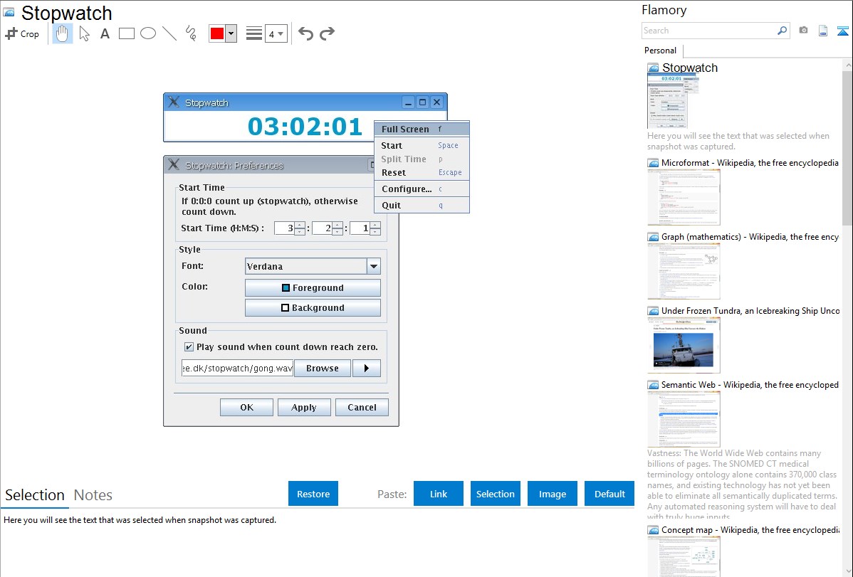 Flamory helps you capture and store screenshots from Stopwatch by pressing a single hotkey. It will be saved to a history, so you can continue doing your tasks without interruptions. Later, you can edit the screenshot: crop, resize, add labels and highlights. After that, you can paste the screenshot into any other document or e-mail message.