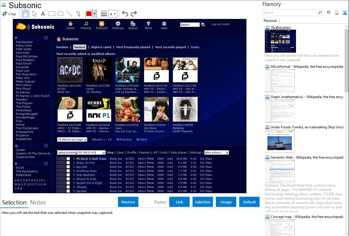 Flamory helps you capture and store screenshots from Subsonic by pressing a single hotkey. It will be saved to a history, so you can continue doing your tasks without interruptions. Later, you can edit the screenshot: crop, resize, add labels and highlights. After that, you can paste the screenshot into any other document or e-mail message.