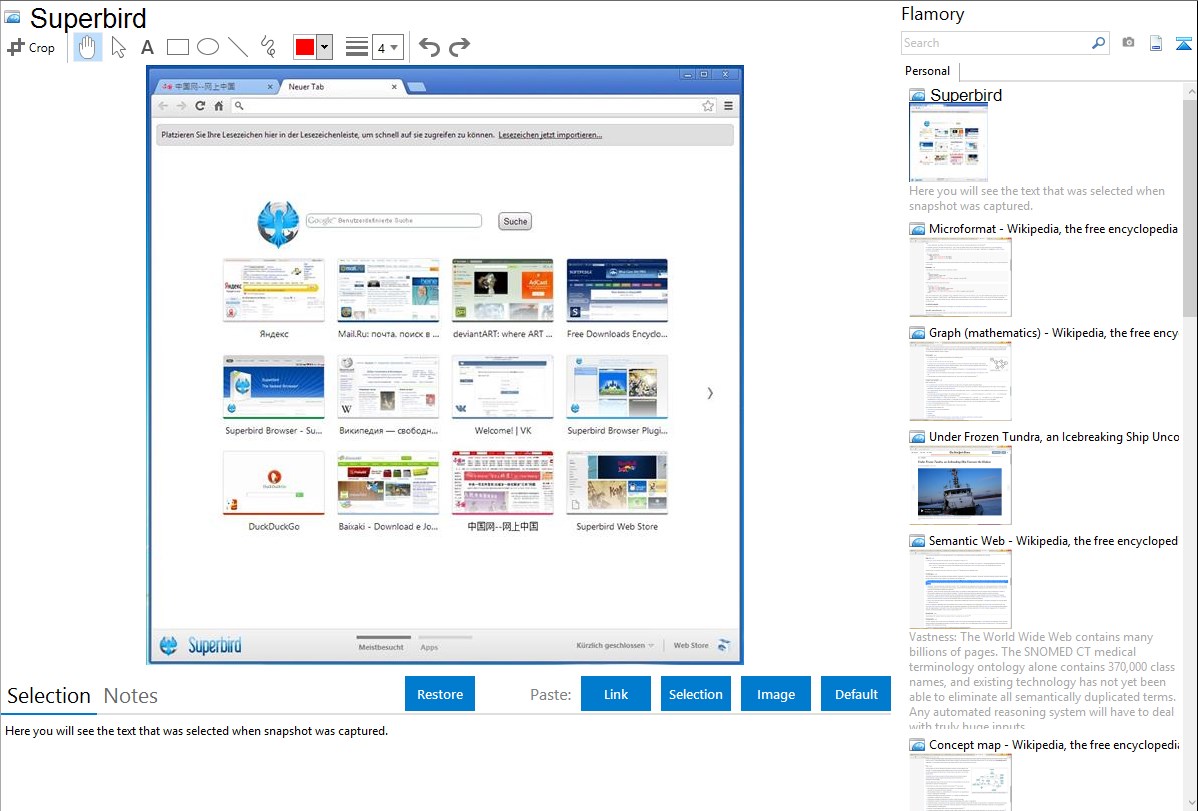 Flamory helps you capture and store screenshots from Superbird by pressing a single hotkey. It will be saved to a history, so you can continue doing your tasks without interruptions. Later, you can edit the screenshot: crop, resize, add labels and highlights. After that, you can paste the screenshot into any other document or e-mail message.
