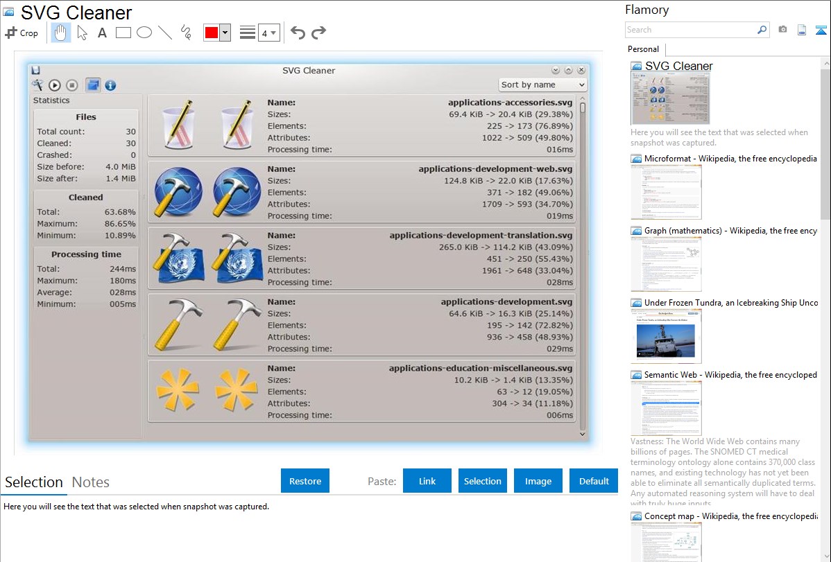 Flamory helps you capture and store screenshots from SVG Cleaner by pressing a single hotkey. It will be saved to a history, so you can continue doing your tasks without interruptions. Later, you can edit the screenshot: crop, resize, add labels and highlights. After that, you can paste the screenshot into any other document or e-mail message.