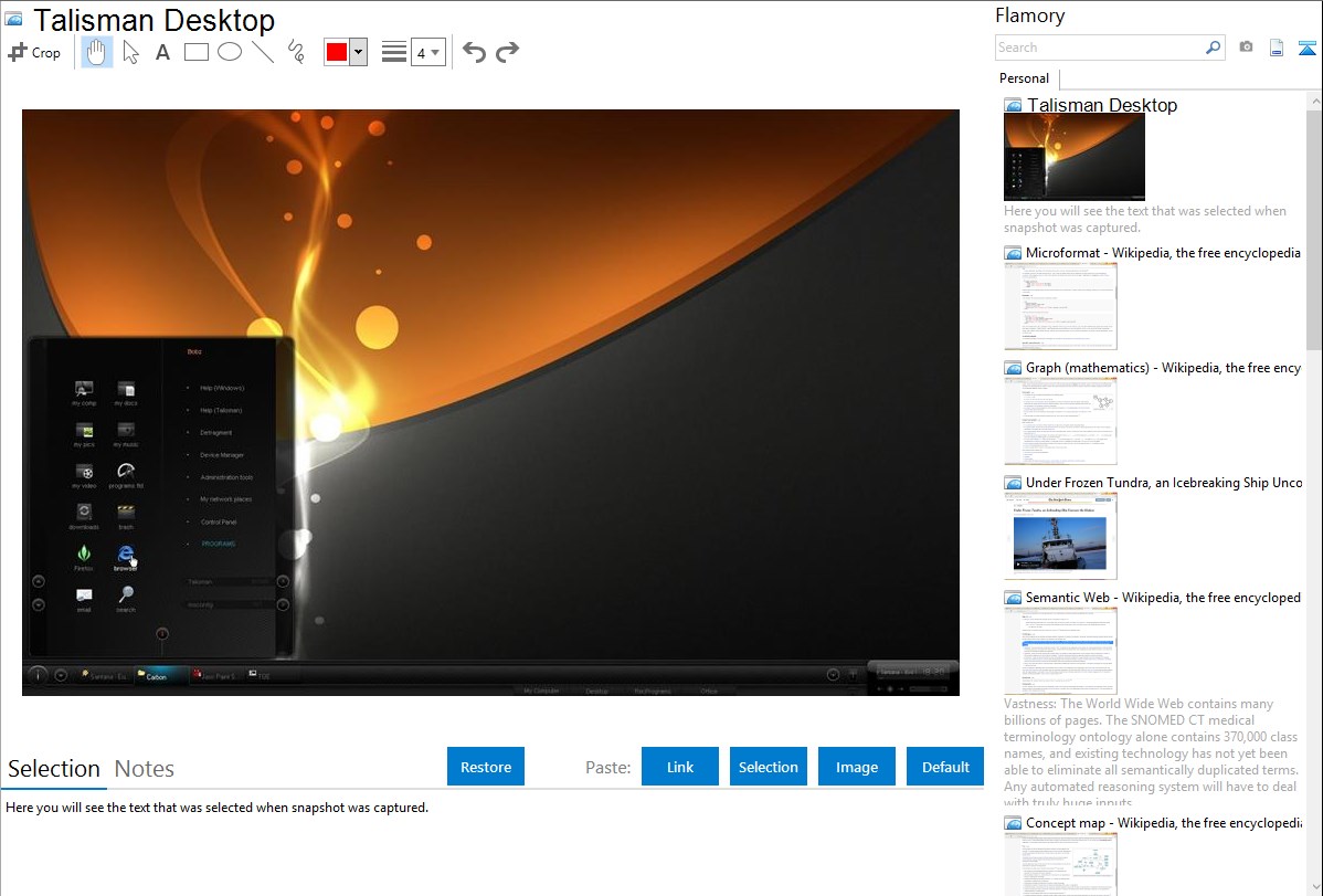 Flamory helps you capture and store screenshots from Talisman Desktop by pressing a single hotkey. It will be saved to a history, so you can continue doing your tasks without interruptions. Later, you can edit the screenshot: crop, resize, add labels and highlights. After that, you can paste the screenshot into any other document or e-mail message.