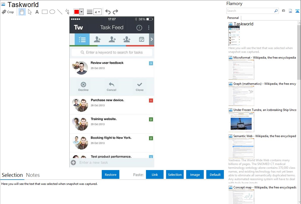 Flamory helps you capture and store screenshots from Taskworld by pressing a single hotkey. It will be saved to a history, so you can continue doing your tasks without interruptions. Later, you can edit the screenshot: crop, resize, add labels and highlights. After that, you can paste the screenshot into any other document or e-mail message.