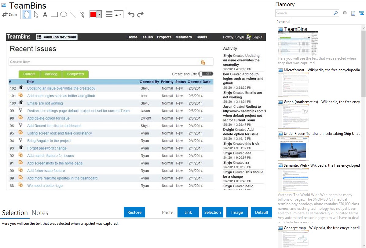 Flamory helps you capture and store screenshots from TeamBins by pressing a single hotkey. It will be saved to a history, so you can continue doing your tasks without interruptions. Later, you can edit the screenshot: crop, resize, add labels and highlights. After that, you can paste the screenshot into any other document or e-mail message.