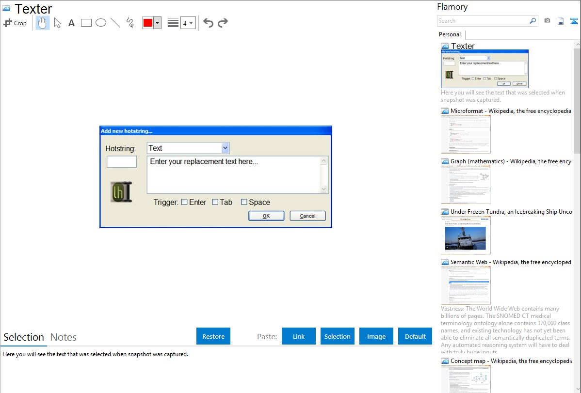 Flamory helps you capture and store screenshots from Texter by pressing a single hotkey. It will be saved to a history, so you can continue doing your tasks without interruptions. Later, you can edit the screenshot: crop, resize, add labels and highlights. After that, you can paste the screenshot into any other document or e-mail message.