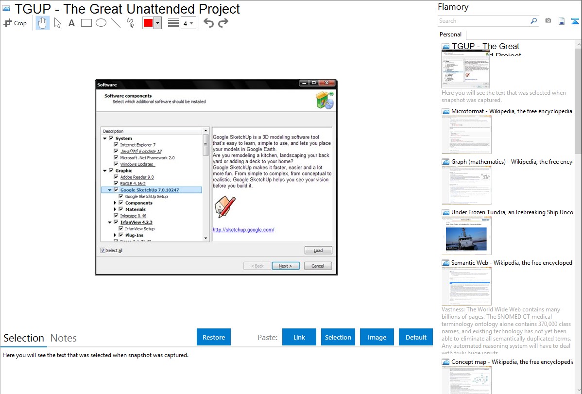 Flamory helps you capture and store screenshots from TGUP - The Great Unattended Project by pressing a single hotkey. It will be saved to a history, so you can continue doing your tasks without interruptions. Later, you can edit the screenshot: crop, resize, add labels and highlights. After that, you can paste the screenshot into any other document or e-mail message.