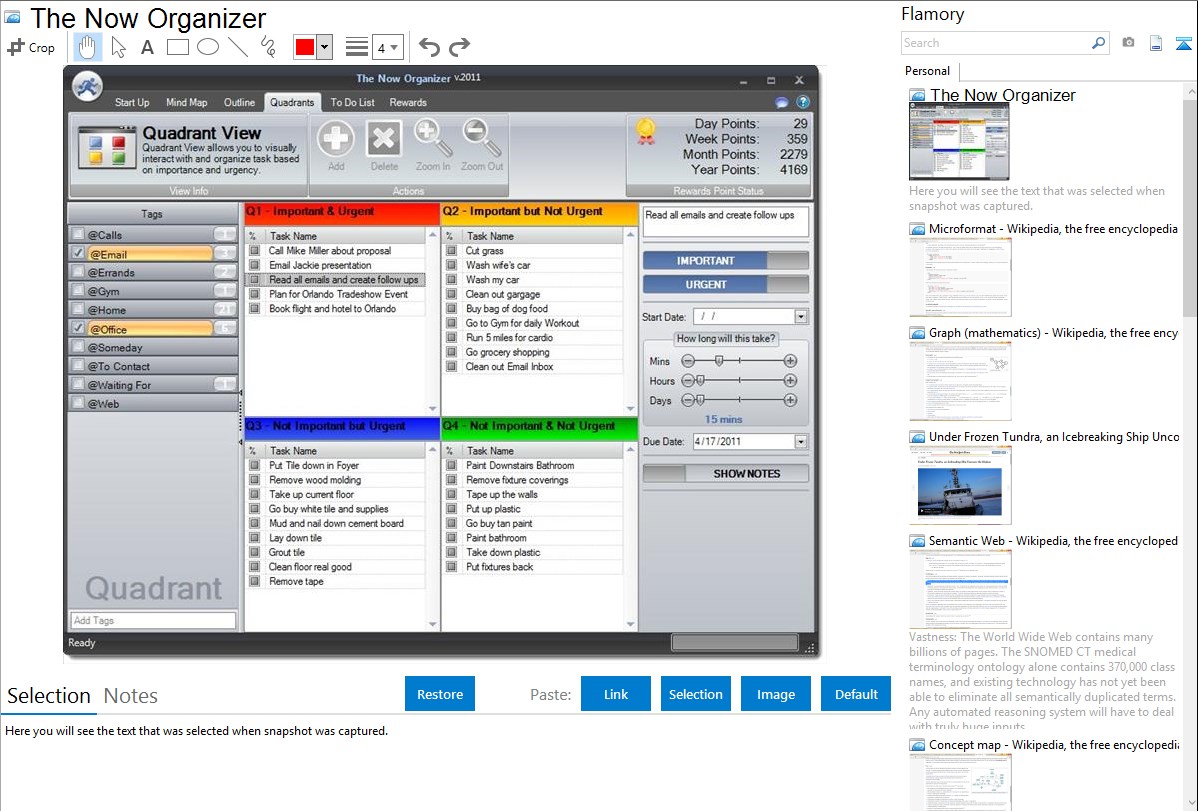 Flamory helps you capture and store screenshots from The Now Organizer by pressing a single hotkey. It will be saved to a history, so you can continue doing your tasks without interruptions. Later, you can edit the screenshot: crop, resize, add labels and highlights. After that, you can paste the screenshot into any other document or e-mail message.