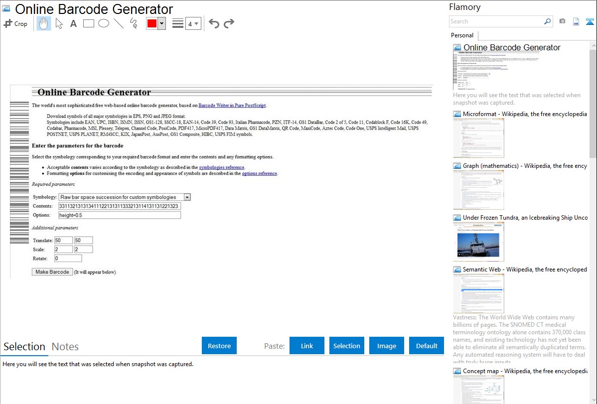 Flamory provides advanced bookmarking for Online Barcode Generator. It captures screen, selection, text on the page and other context. You can find this bookmark later using search by page content or looking through thumbnail list.