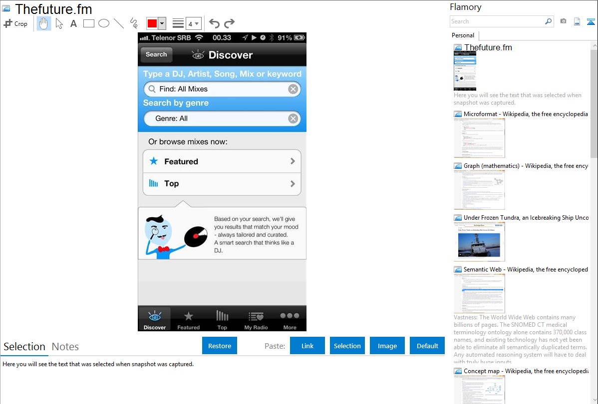 Flamory helps you capture and store screenshots from Thefuture.fm by pressing a single hotkey. It will be saved to a history, so you can continue doing your tasks without interruptions. Later, you can edit the screenshot: crop, resize, add labels and highlights. After that, you can paste the screenshot into any other document or e-mail message.
