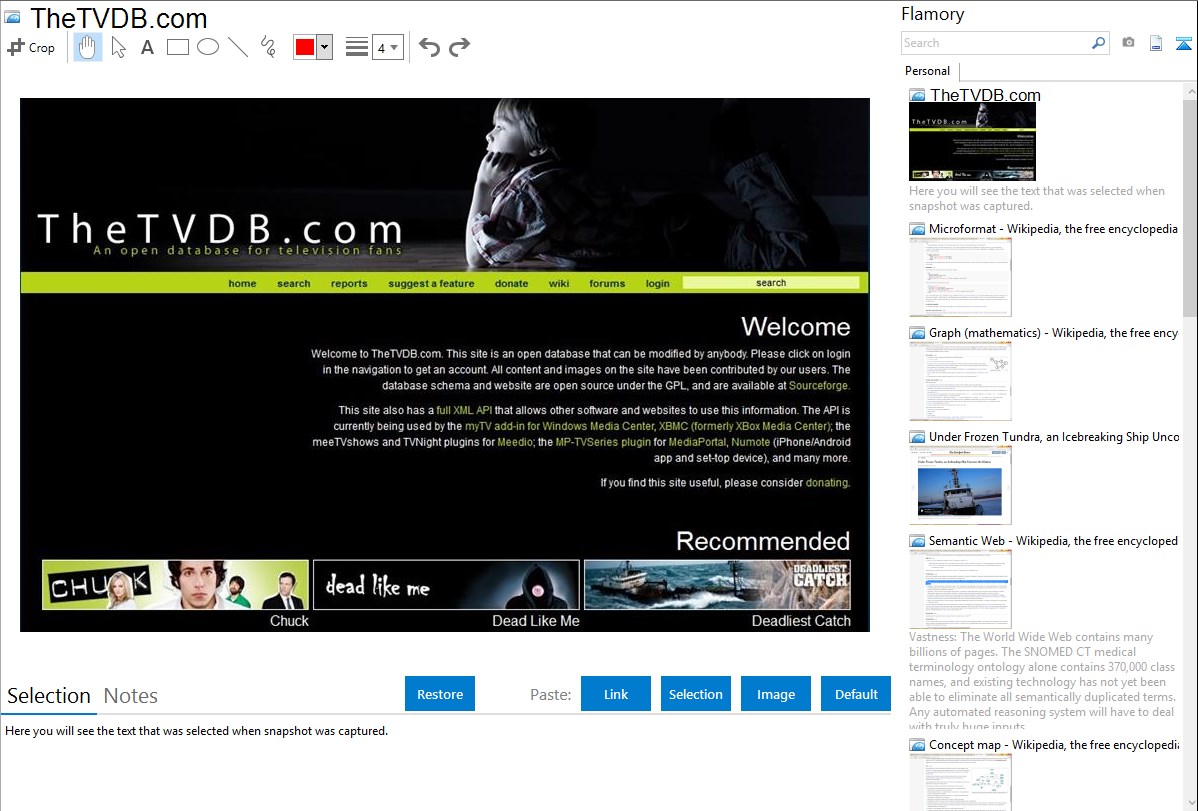 Flamory helps you capture and store screenshots from TheTVDB.com by pressing a single hotkey. It will be saved to a history, so you can continue doing your tasks without interruptions. Later, you can edit the screenshot: crop, resize, add labels and highlights. After that, you can paste the screenshot into any other document or e-mail message.