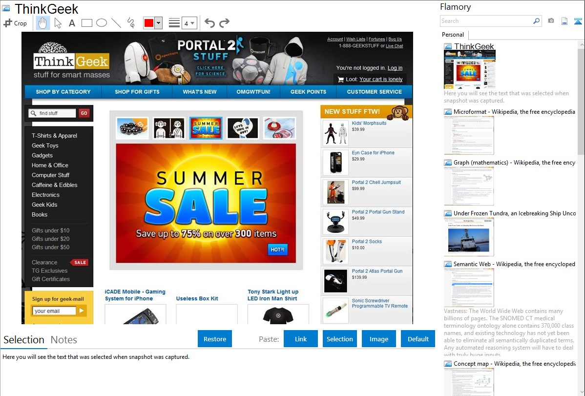 Flamory helps you capture and store screenshots from ThinkGeek by pressing a single hotkey. It will be saved to a history, so you can continue doing your tasks without interruptions. Later, you can edit the screenshot: crop, resize, add labels and highlights. After that, you can paste the screenshot into any other document or e-mail message.