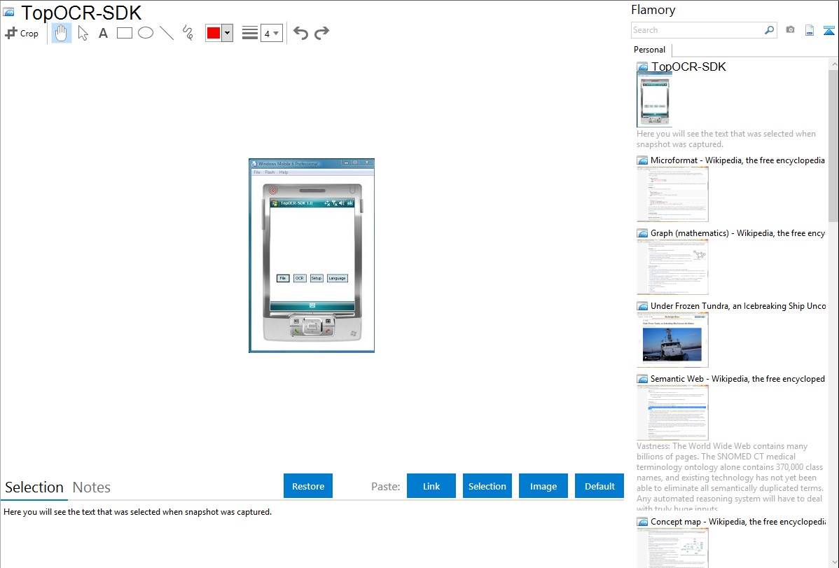 Flamory helps you capture and store screenshots from TopOCR-SDK by pressing a single hotkey. It will be saved to a history, so you can continue doing your tasks without interruptions. Later, you can edit the screenshot: crop, resize, add labels and highlights. After that, you can paste the screenshot into any other document or e-mail message.