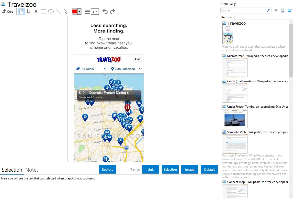 Flamory helps you capture and store screenshots from Travelzoo by pressing a single hotkey. It will be saved to a history, so you can continue doing your tasks without interruptions. Later, you can edit the screenshot: crop, resize, add labels and highlights. After that, you can paste the screenshot into any other document or e-mail message.