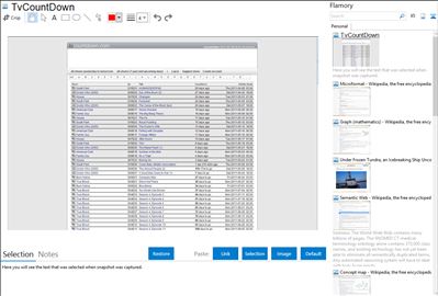 Flamory helps you capture and store screenshots from TvCountDown by pressing a single hotkey. It will be saved to a history, so you can continue doing your tasks without interruptions. Later, you can edit the screenshot: crop, resize, add labels and highlights. After that, you can paste the screenshot into any other document or e-mail message.