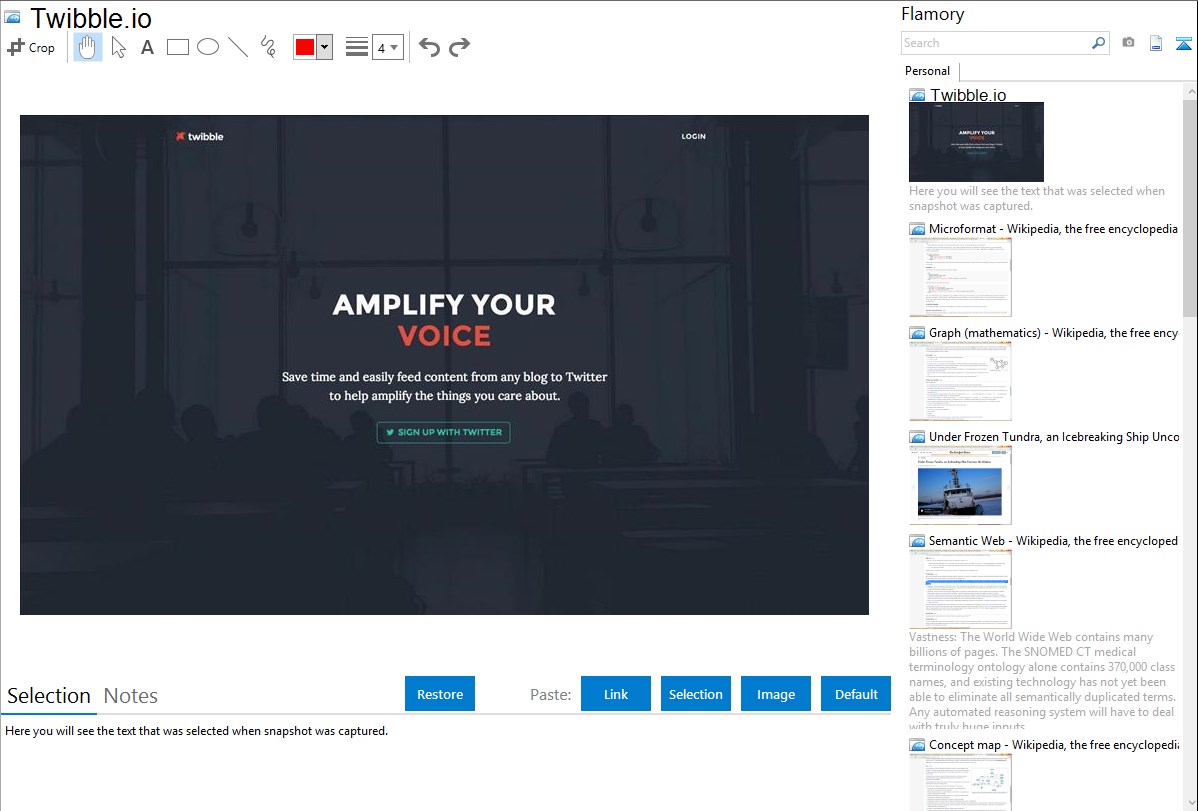 Flamory helps you capture and store screenshots from Twibble.io by pressing a single hotkey. It will be saved to a history, so you can continue doing your tasks without interruptions. Later, you can edit the screenshot: crop, resize, add labels and highlights. After that, you can paste the screenshot into any other document or e-mail message.