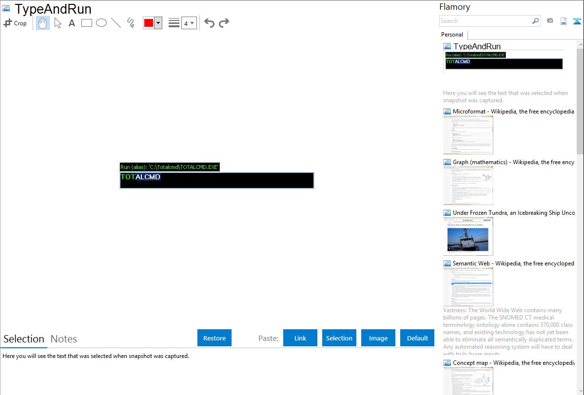 Flamory helps you capture and store screenshots from TypeAndRun by pressing a single hotkey. It will be saved to a history, so you can continue doing your tasks without interruptions. Later, you can edit the screenshot: crop, resize, add labels and highlights. After that, you can paste the screenshot into any other document or e-mail message.