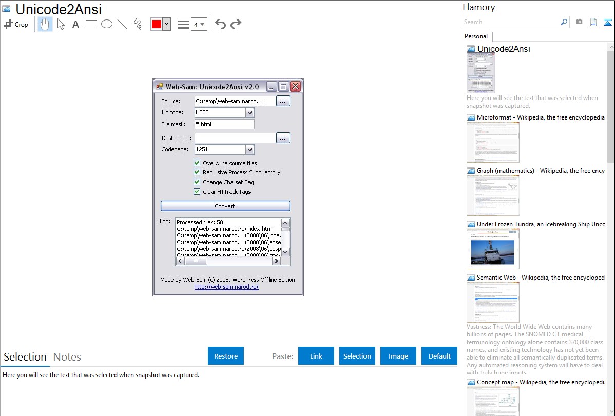 Flamory helps you capture and store screenshots from Unicode2Ansi by pressing a single hotkey. It will be saved to a history, so you can continue doing your tasks without interruptions. Later, you can edit the screenshot: crop, resize, add labels and highlights. After that, you can paste the screenshot into any other document or e-mail message.