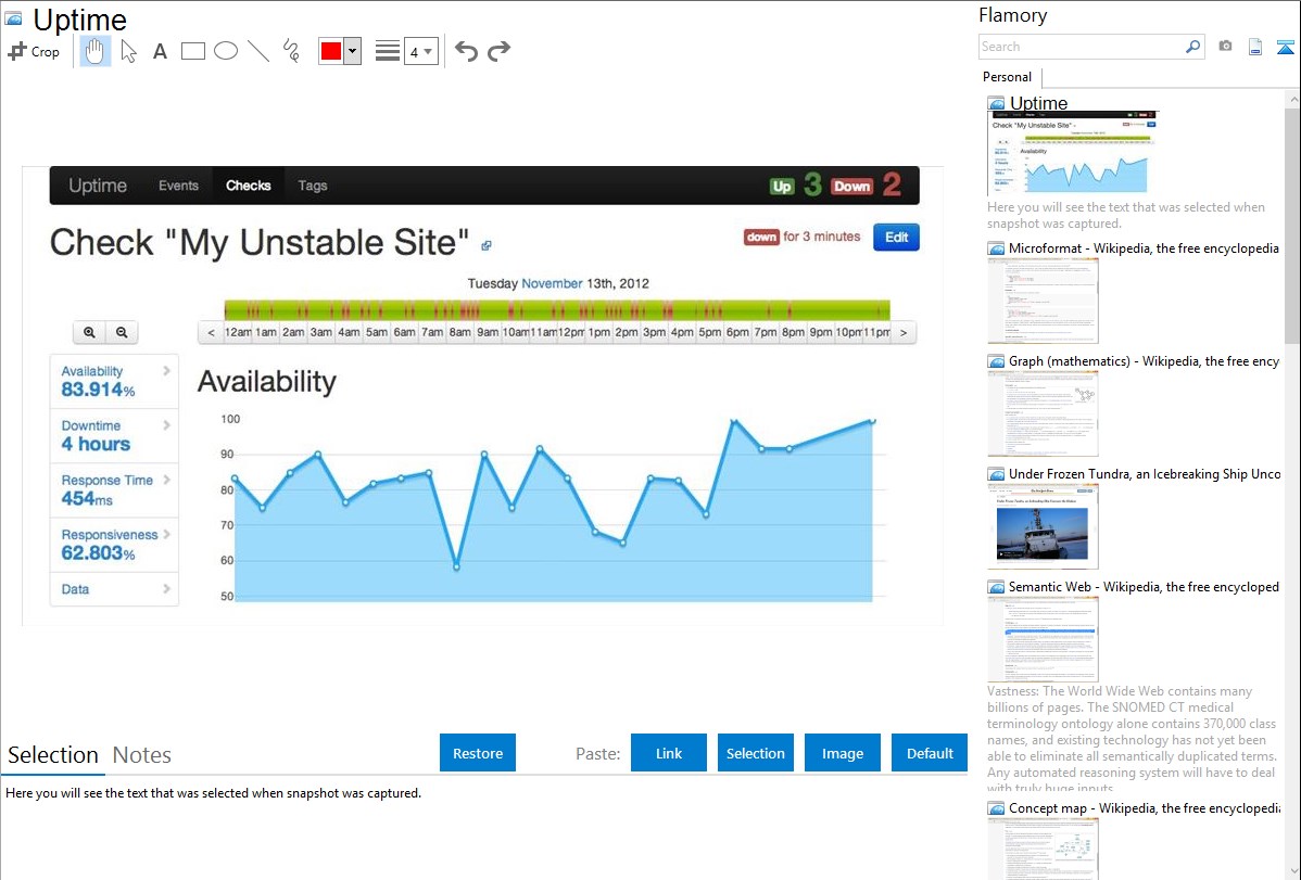 Flamory helps you capture and store screenshots from Uptime by pressing a single hotkey. It will be saved to a history, so you can continue doing your tasks without interruptions. Later, you can edit the screenshot: crop, resize, add labels and highlights. After that, you can paste the screenshot into any other document or e-mail message.