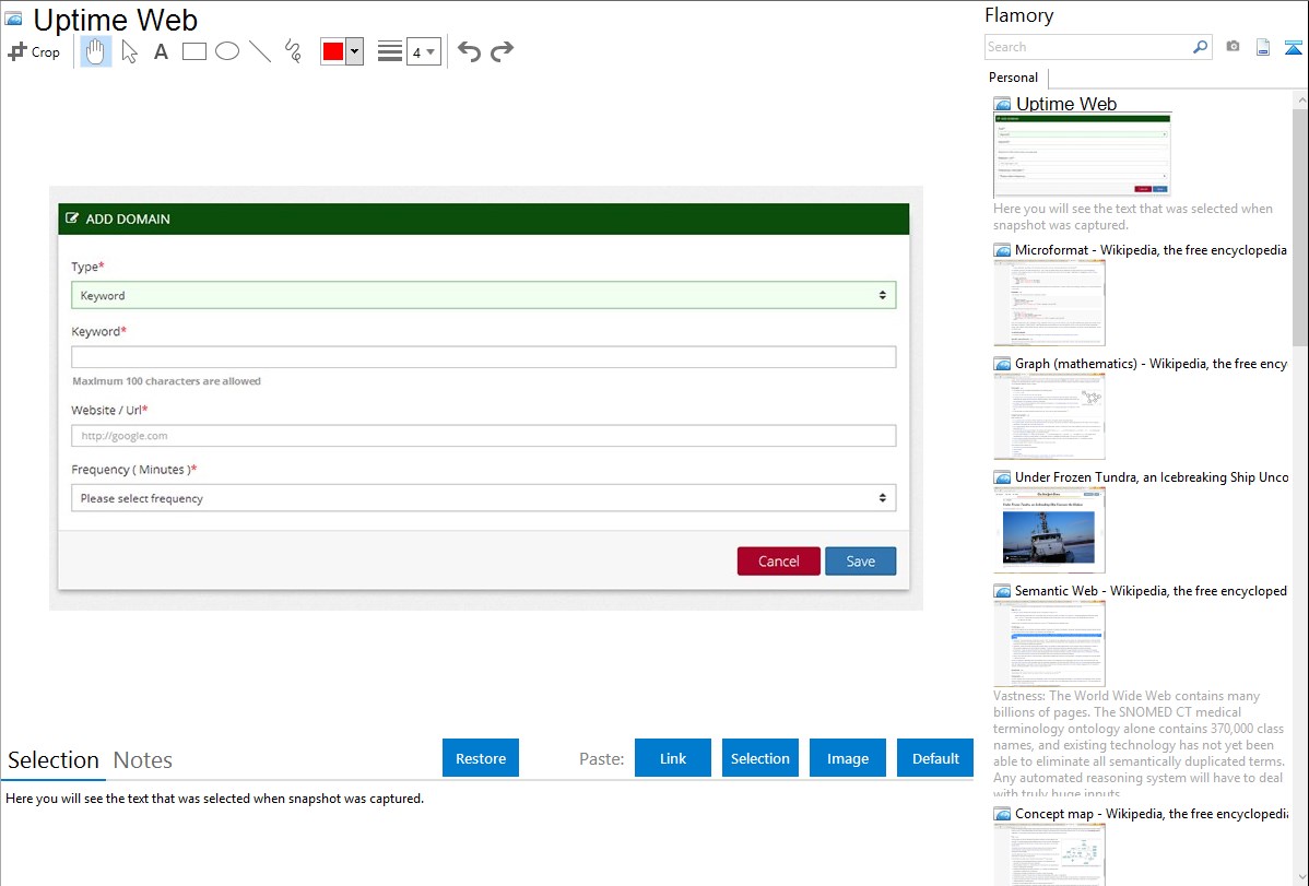 Flamory helps you capture and store screenshots from Uptime Web by pressing a single hotkey. It will be saved to a history, so you can continue doing your tasks without interruptions. Later, you can edit the screenshot: crop, resize, add labels and highlights. After that, you can paste the screenshot into any other document or e-mail message.