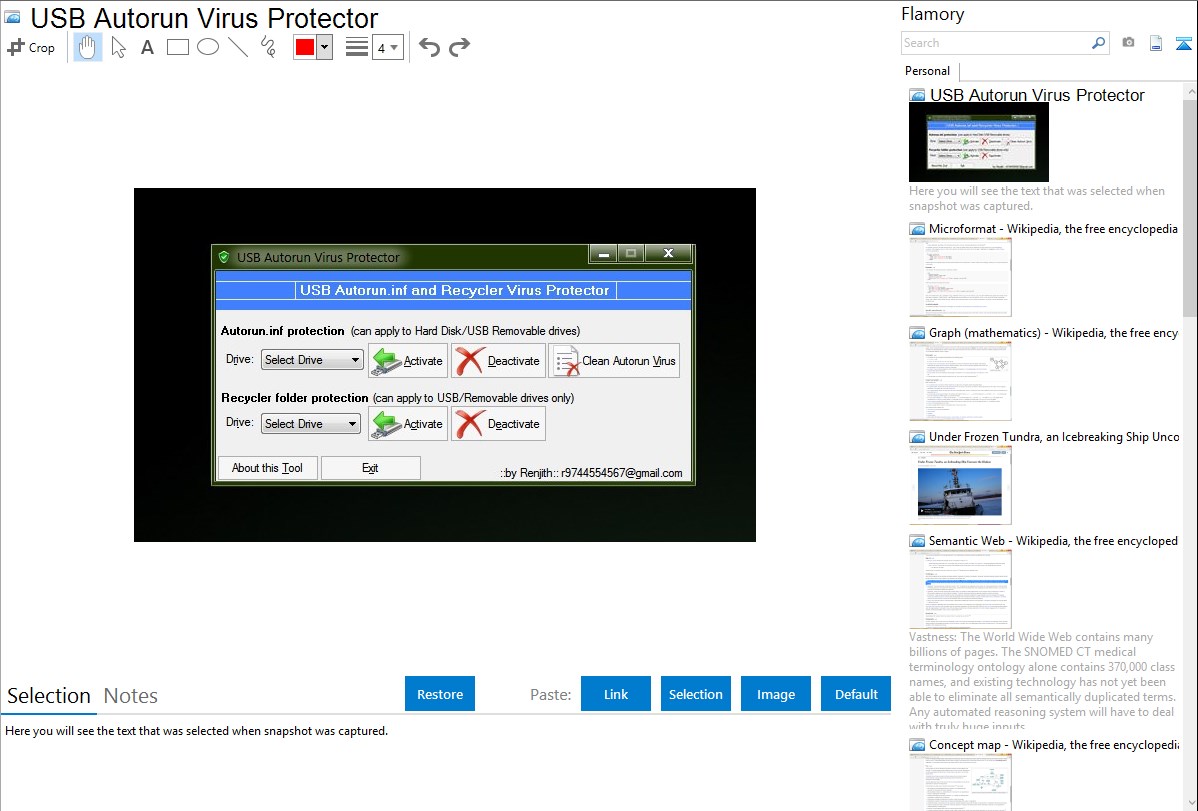 Flamory helps you capture and store screenshots from USB Autorun Virus Protector by pressing a single hotkey. It will be saved to a history, so you can continue doing your tasks without interruptions. Later, you can edit the screenshot: crop, resize, add labels and highlights. After that, you can paste the screenshot into any other document or e-mail message.