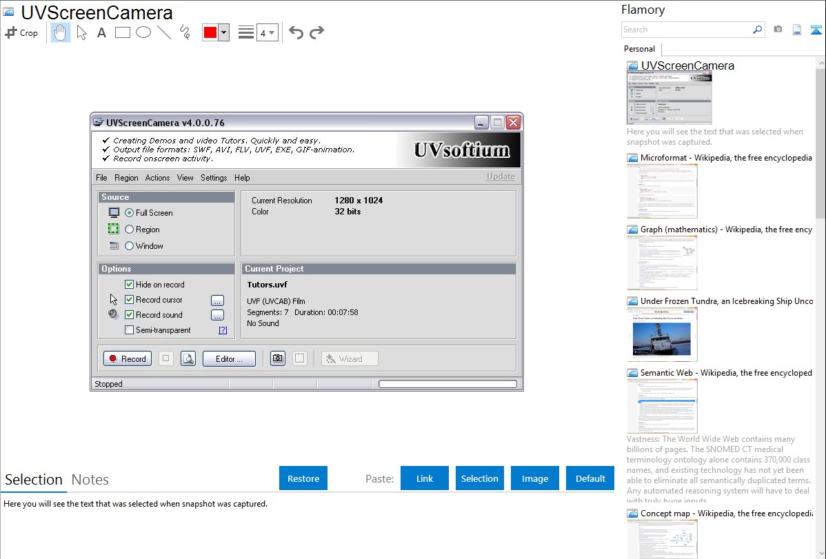 Flamory helps you capture and store screenshots from UVScreenCamera by pressing a single hotkey. It will be saved to a history, so you can continue doing your tasks without interruptions. Later, you can edit the screenshot: crop, resize, add labels and highlights. After that, you can paste the screenshot into any other document or e-mail message.