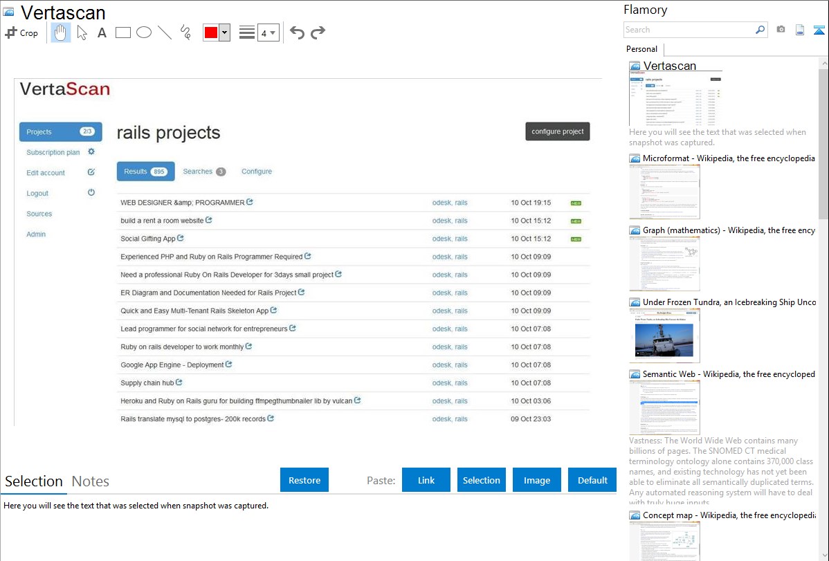 Flamory helps you capture and store screenshots from Vertascan by pressing a single hotkey. It will be saved to a history, so you can continue doing your tasks without interruptions. Later, you can edit the screenshot: crop, resize, add labels and highlights. After that, you can paste the screenshot into any other document or e-mail message.