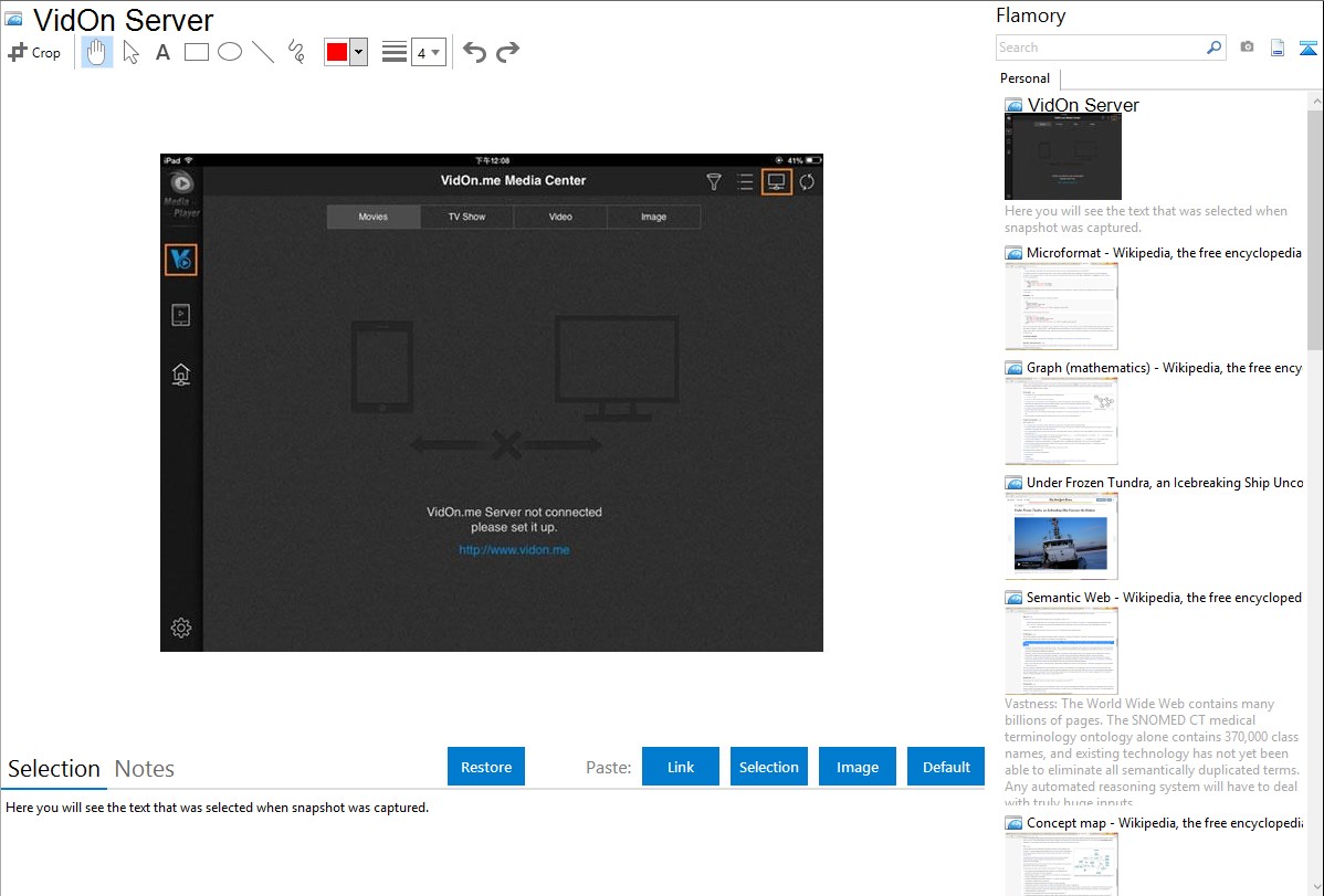 Flamory helps you capture and store screenshots from VidOn Server by pressing a single hotkey. It will be saved to a history, so you can continue doing your tasks without interruptions. Later, you can edit the screenshot: crop, resize, add labels and highlights. After that, you can paste the screenshot into any other document or e-mail message.