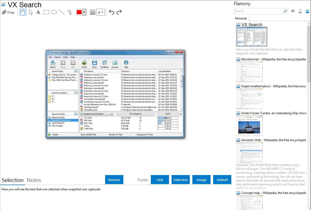 Flamory helps you capture and store screenshots from VX Search by pressing a single hotkey. It will be saved to a history, so you can continue doing your tasks without interruptions. Later, you can edit the screenshot: crop, resize, add labels and highlights. After that, you can paste the screenshot into any other document or e-mail message.
