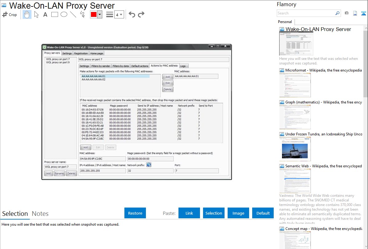 Flamory helps you capture and store screenshots from Wake-On-LAN Proxy Server by pressing a single hotkey. It will be saved to a history, so you can continue doing your tasks without interruptions. Later, you can edit the screenshot: crop, resize, add labels and highlights. After that, you can paste the screenshot into any other document or e-mail message.