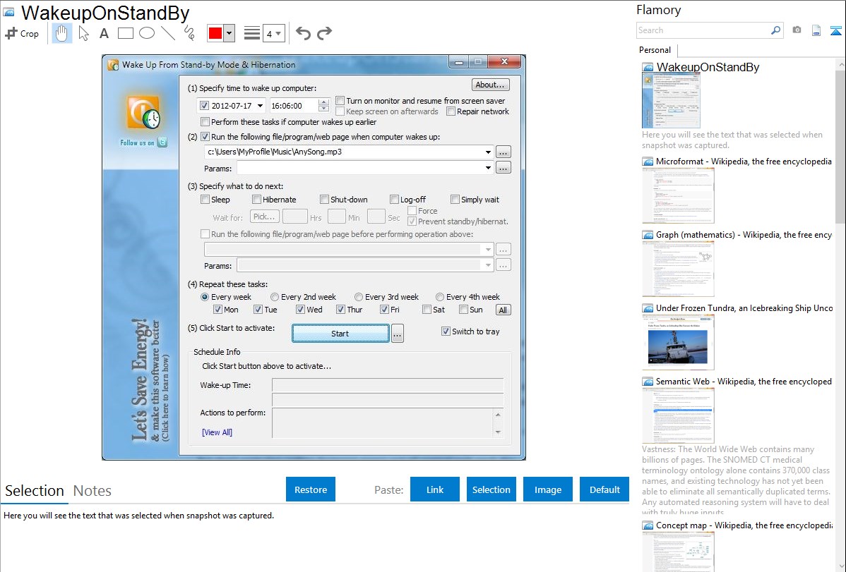 Flamory helps you capture and store screenshots from WakeupOnStandBy by pressing a single hotkey. It will be saved to a history, so you can continue doing your tasks without interruptions. Later, you can edit the screenshot: crop, resize, add labels and highlights. After that, you can paste the screenshot into any other document or e-mail message.
