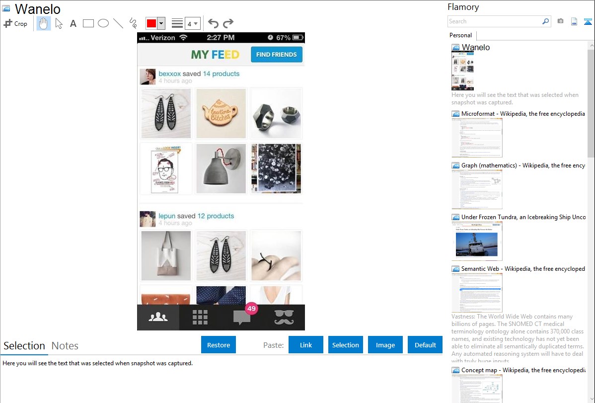 Flamory helps you capture and store screenshots from Wanelo by pressing a single hotkey. It will be saved to a history, so you can continue doing your tasks without interruptions. Later, you can edit the screenshot: crop, resize, add labels and highlights. After that, you can paste the screenshot into any other document or e-mail message.