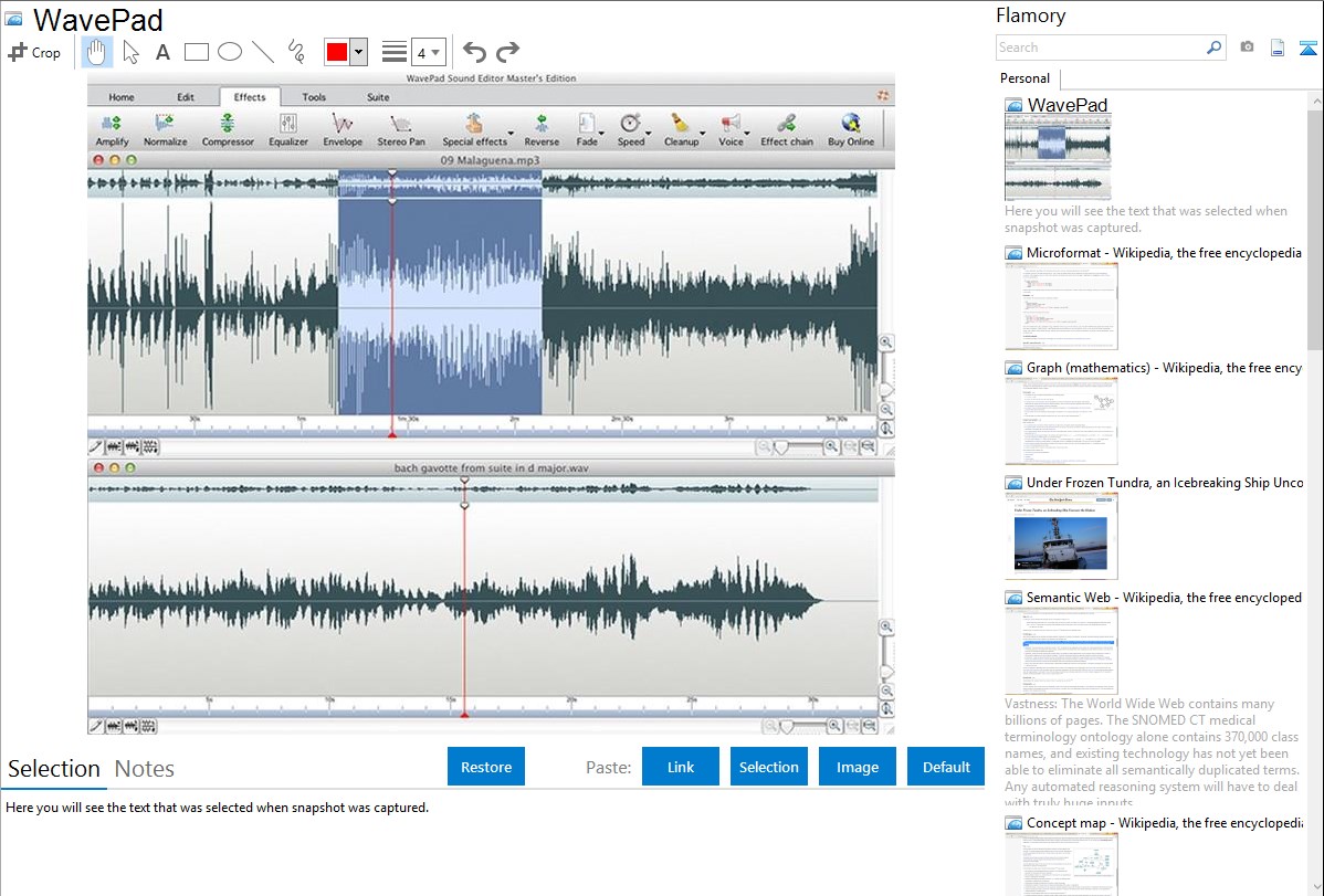 Flamory helps you capture and store screenshots from WavePad by pressing a single hotkey. It will be saved to a history, so you can continue doing your tasks without interruptions. Later, you can edit the screenshot: crop, resize, add labels and highlights. After that, you can paste the screenshot into any other document or e-mail message.