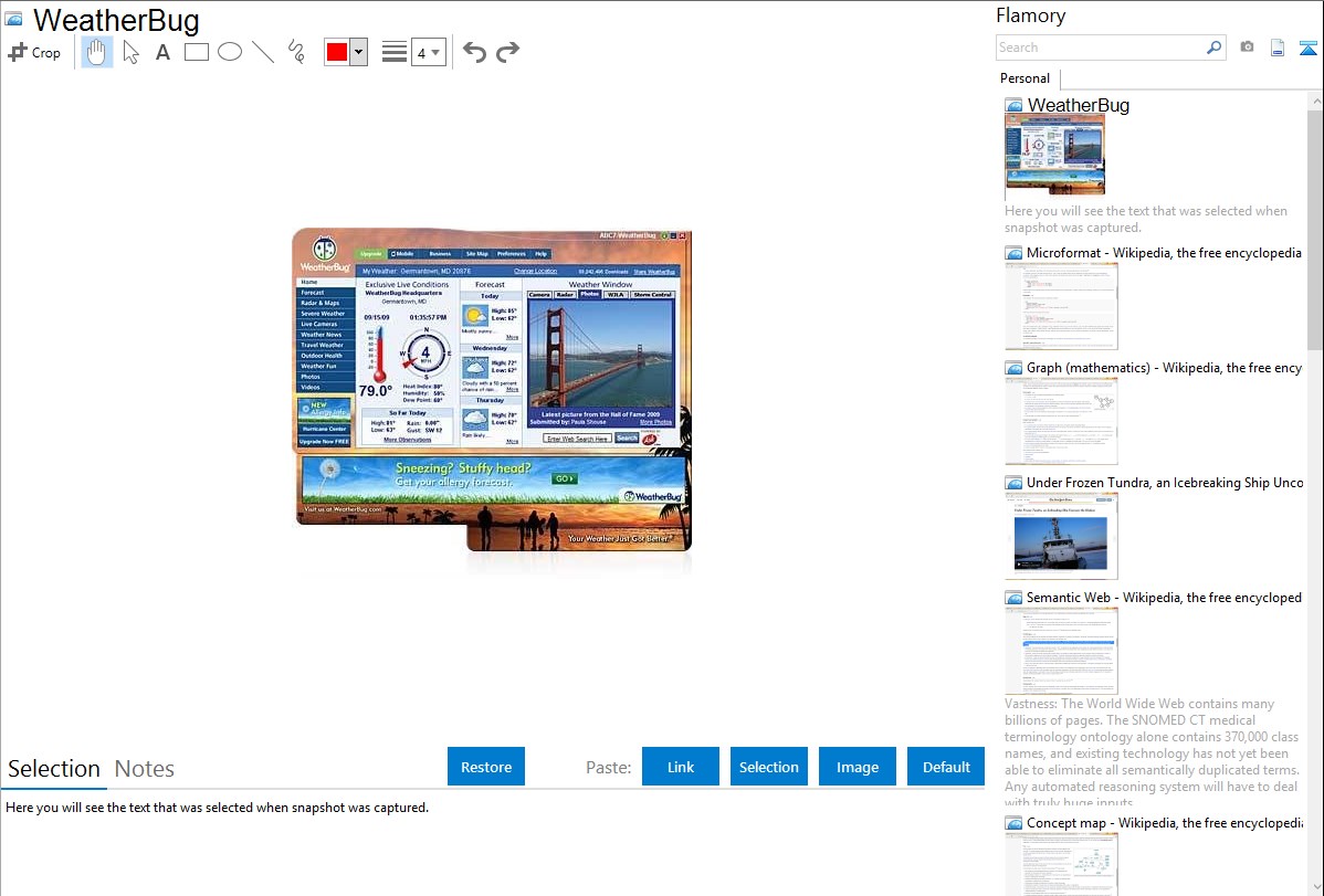 Flamory helps you capture and store screenshots from WeatherBug by pressing a single hotkey. It will be saved to a history, so you can continue doing your tasks without interruptions. Later, you can edit the screenshot: crop, resize, add labels and highlights. After that, you can paste the screenshot into any other document or e-mail message.
