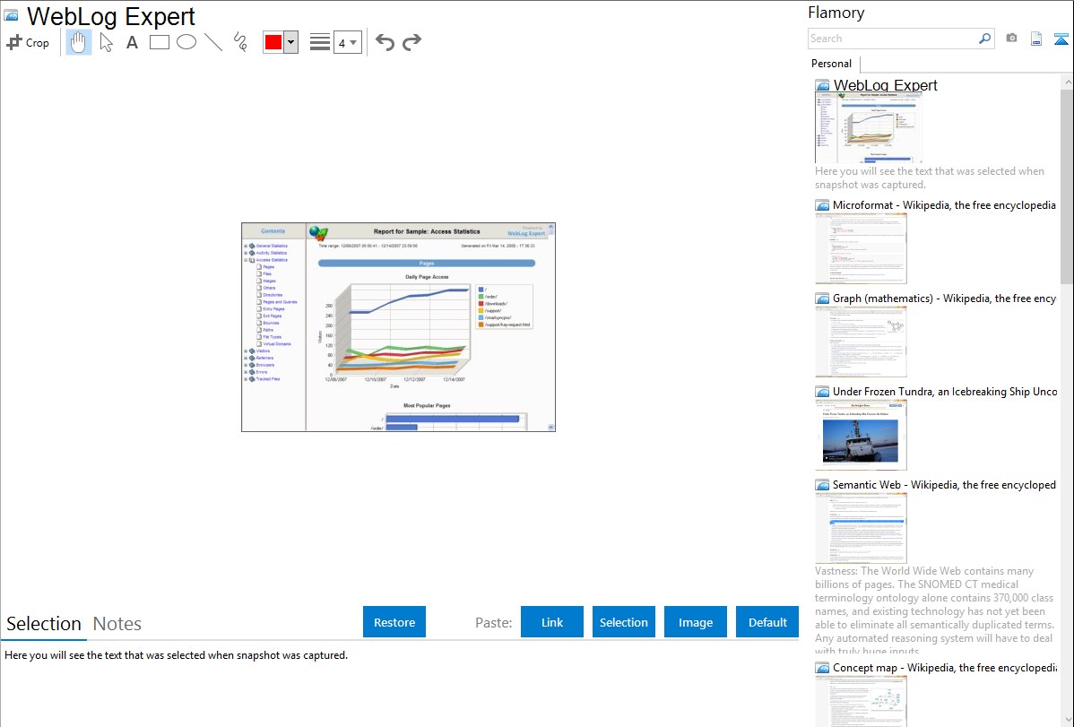Flamory helps you capture and store screenshots from WebLog Expert by pressing a single hotkey. It will be saved to a history, so you can continue doing your tasks without interruptions. Later, you can edit the screenshot: crop, resize, add labels and highlights. After that, you can paste the screenshot into any other document or e-mail message.