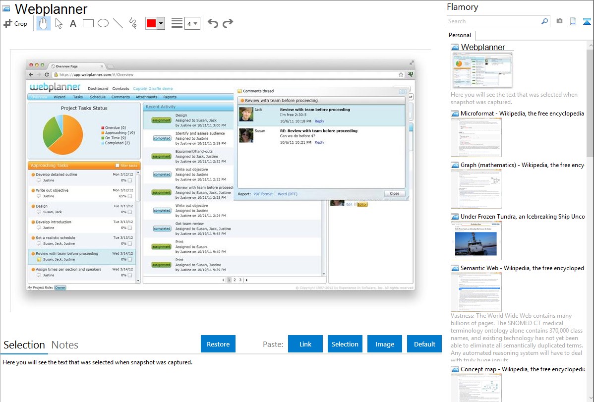 Flamory helps you capture and store screenshots from Webplanner by pressing a single hotkey. It will be saved to a history, so you can continue doing your tasks without interruptions. Later, you can edit the screenshot: crop, resize, add labels and highlights. After that, you can paste the screenshot into any other document or e-mail message.